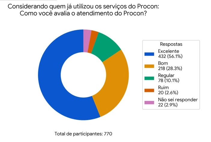 Entre os 770 que já utilizaram os serviços do Procon, a maioria absoluta, 96,9% (746 pessoas), recomendaria os serviços. Apenas 3,1% (24 pessoas) não indicariam os serviços do Procon a terceiros. Entre os 770 usuários do Procon, a avaliação do atendimento é majoritariamente positiva. Aproximadamente 56,1% (432 pessoas) consideram o atendimento “Excelente” e 28,3% (218 pessoas) o classificam como “Bom”. Somente 10,1% (78 pessoas) o veem como “Regular” e 2,6% (20 pessoas) o julgam “Ruim”.