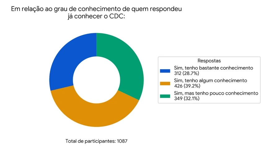 Dentre as 1.087 pessoas que conhecem o CDC, as respostas sobre o grau de conhecimento apresentam variações. A maior parte (39,2% ou 426 participantes) possui “algum conhecimento”, enquanto 32,1% (349 pessoas) afirmam ter “pouco conhecimento”. Surpreendentemente, uma parte considerável, 28,7% (312 participantes), diz ter “bastante conhecimento” sobre o Código.