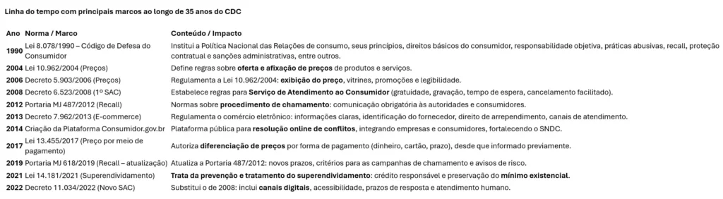 Fabíola Meira de Almeida Breseghello é sócia do Meira Breseghello Advogados. Ela é especialista em Direito das Relações de Consumo e elaborou, para a Consumidor Moderno, um quadro comparativo com os principais marcos desde o lançamento do CDC. Veja abaixo: