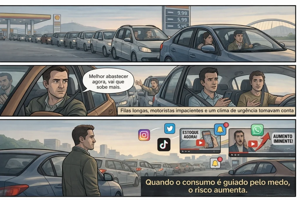 A cena, cada vez mais frequente, não é apenas reflexo da alta dos combustíveis. Ela também é alimentada por uma onda de conteúdos nas redes sociais que incentivam estoques e consumo preventivo.