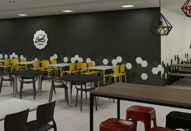 Há um predomínio de tons sóbrios e detalhes em concreto, um conceito inovador para restaurantes corporativos;