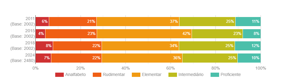 Na somatória, o Brasil contabiliza 29% de pessoas analfabetas funcionais. Em comparação ao ano de 2009, o percentual de indivíduos analfabetos era de 7%, e de analfabetos rudimentares, 20%.