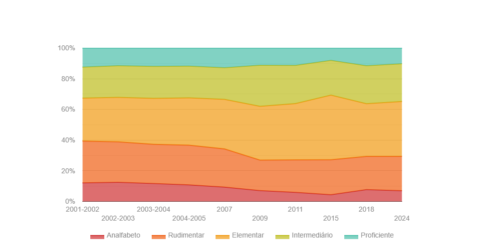 “Ao longo dos anos, houve também uma redução da proporção de brasileiros no nível Rudimentar (que fazem um uso bastante limitado da leitura, da escrita e das operações matemáticas em suas tarefas do cotidiano), de 27%, em 2001-2002, para um patamar estabilizado de pouco mais de 20% desde 2009”, destaca a atualização de 2024 do Inaf.