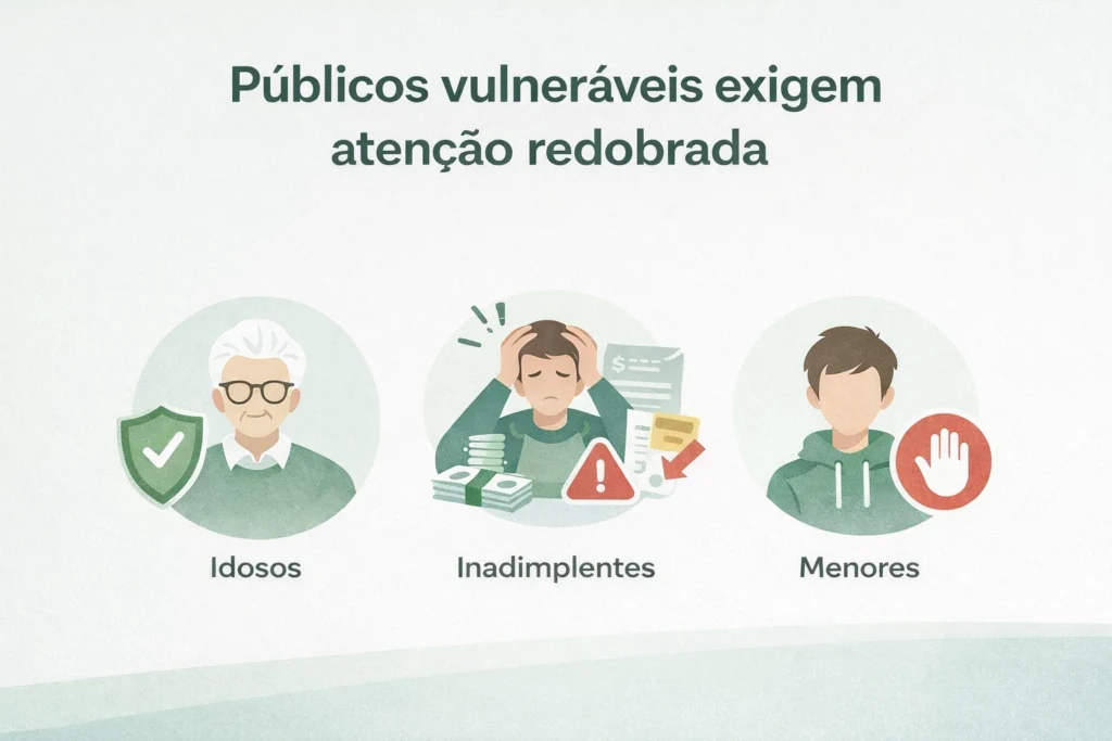 - Consumidores idosos, mais suscetíveis a fraudes e desinformação.