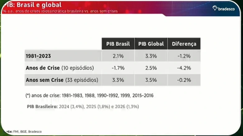 A resolução dessa questão, segundo Fernando Honorato, é vista como essencial para a estabilidade financeira e deve ocorrer após as eleições de 2026. Embora a dívida global tenha aumentado, a situação brasileira é mais complicada e não deve levar a uma crise fiscal aberta. “Historicamente, o Brasil cresceu 2% ao ano nos últimos 45 anos, abaixo da média mundial de 3%. O desempenho se agrava em anos de crise local, mas evitando crises o crescimento pode ser estável”, disse.
