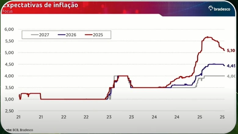 O dólar está fraco, enquanto o real mantém um nível razoável de estabilidade. A boa notícia é que a taxa de juros está aumentando a probabilidade de queda. “O Banco Central acompanha isso com muita atenção na hora de decidir sobre a Selic. O mercado financeiro indica que, sim, a Selic deve cair. No final do próximo ano, as projeções do mercado apontam para uma Selic em torno de 13%. O Bradesco, por sua vez, estima que a Selic pode ficar em 11,75% no próximo ano, um valor significativamente abaixo do atual, especialmente considerando o comportamento do mercado de ações”, afirma Honorato.