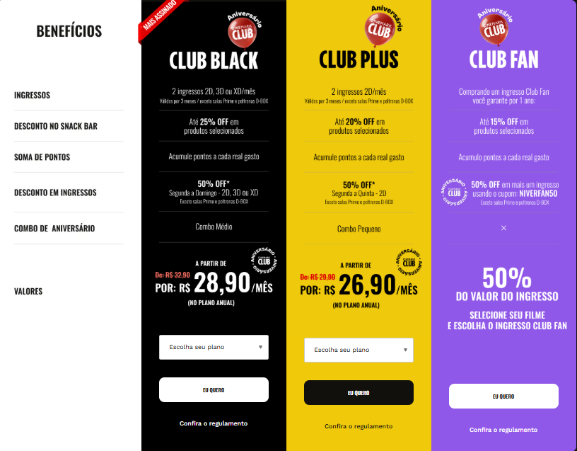 O programa combina três frentes principais: ingressos, descontos e acúmulo de pontos. O valor da mensalidade varia entre R$29,90 e R$32,90, de acordo com o pacote escolhido.