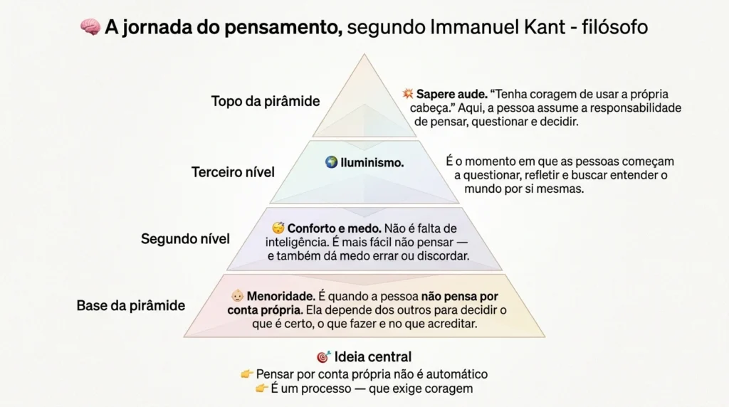 Para Kant, a preguiça e a covardia impedem que as pessoas assumam a responsabilidade de pensar por si mesmas, algo que ressoa perfeitamente com o mundo digital de hoje. Quando ignoramos isso, corremos o risco de normalizar a irresponsabilidade, confiando cegamente nas “decisões” dos algoritmos.