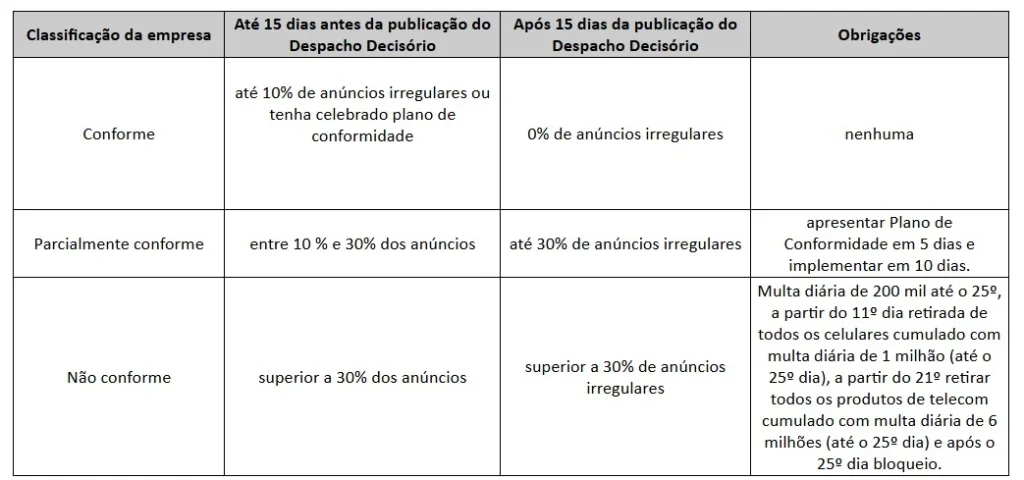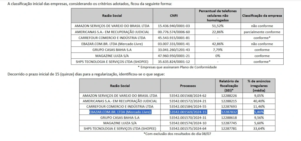 Em 2024, a Agência Nacional de Telecomunicações (Anatel) publicou o Despacho Decisório nº 5.657/2024/ORCN/SOR (SEI nº 12160352), que classifica marketplaces como “conformes” ou “não conformes” com base no cumprimento de requisitos legais para a venda de celulares.