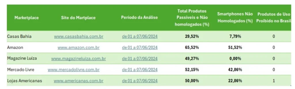 As plataformas parcialmente conformes ainda precisam realizar ajustes para cumprir integralmente o regulamento. Já aquelas classificadas como não conformes operam com um volume significativo de produtos não homologados, o que representa riscos ao consumidor.