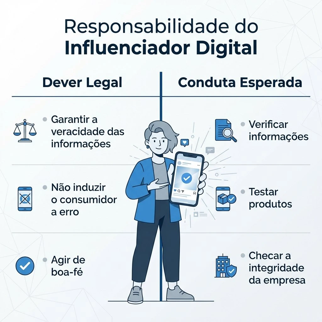 Isso implica que ele deve verificar informações, testar produtos (quando razoável) e checar a idoneidade da empresa antes de fazer uma recomendação pública, pois sua imagem e reputação estão atreladas àquilo que é promovido.