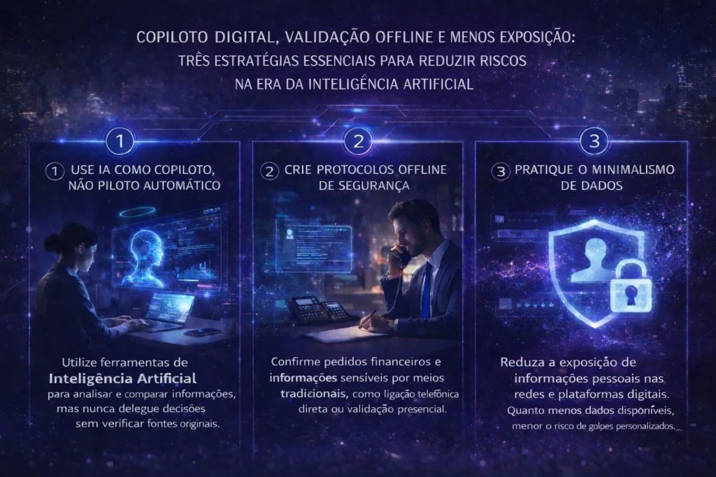 E, por fim, mas não menos importante, adote o minimalismo de dados. O consumidor deve reduzir a exposição de rotinas, áudios longos e informações pessoais em perfis públicos. Quanto menos dados disponíveis, mais difícil se torna criar golpes personalizados.