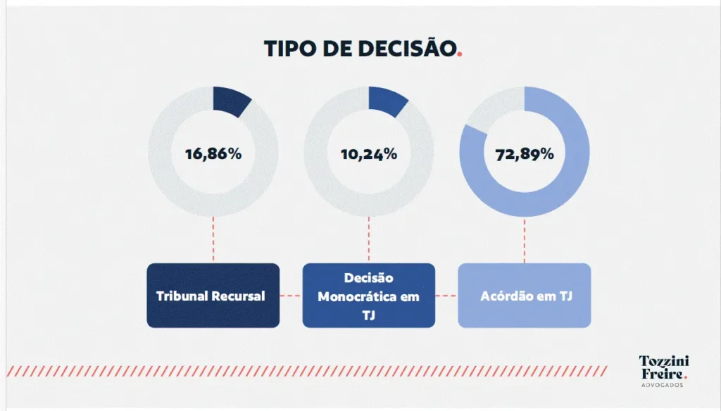 Outro dado importante do estudo é que 72,89% das decisões são acórdãos em tribunais de justiça. Isso mostra que o tema está sendo consolidado em segundo grau, e não apenas em decisões isoladas de juizados.