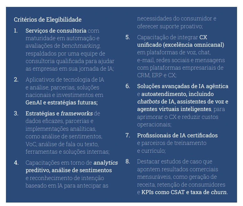 O relatório ISG também avaliou 23 fornecedores em três categorias: Digital Operations, Intelligent Agent Experience e Intelligent CX (AI & Analytics). Entre os destaques, AeC, Atento, Concentrix, Foundever, Konecta, Neo Hypeone e TP foram reconhecidos como líderes em todos os quadrantes, enquanto Algar Tech e Almaviva Experience se destacaram em dois. Stefanini também foi mencionada como líder em um quadrante. Ademais, empresas como Algar Tech, Callink e Stefanini foram nomeadas como Rising Stars, destacando seu potencial promissor no mercado.