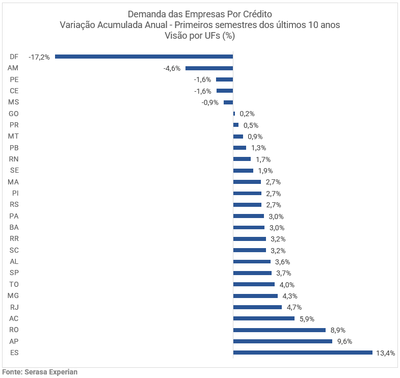 Regionalmente, o Espírito Santo destacou-se com o maior percentual de aumento na demanda por crédito, com um crescimento de 13,4%. Em contraste, o Distrito Federal teve a queda mais acentuada (-17,2%).