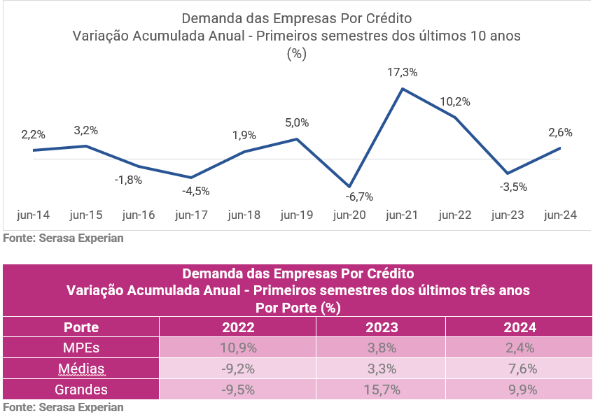 A demanda das empresas brasileiras por crédito registrou um crescimento de 2,6% no primeiro semestre de 2024, em comparação com o mesmo período do ano anterior. Este aumento, revelado pelo Indicador de Demanda das Empresas por Crédito da Serasa Experian, foi particularmente impulsionado pelas grandes empresas, que apresentaram um crescimento de 9,9% no período.
