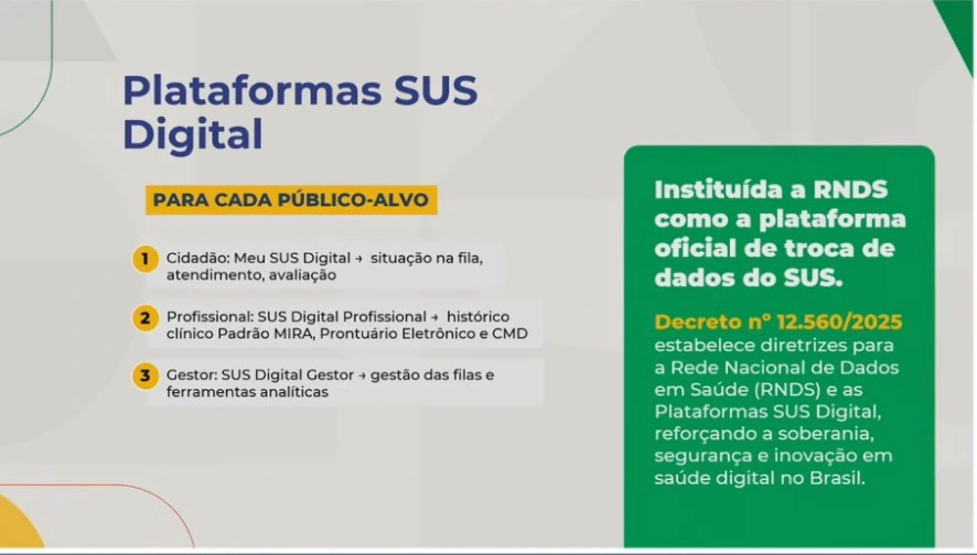 Segundo a secretária, esse desenho ganha reforço institucional com o Decreto nº 12.560/2025, que estabelece diretrizes para a RNDS e as Plataformas SUS Digital, com a promessa de fortalecer soberania, segurança e inovação na saúde digital no Brasil.