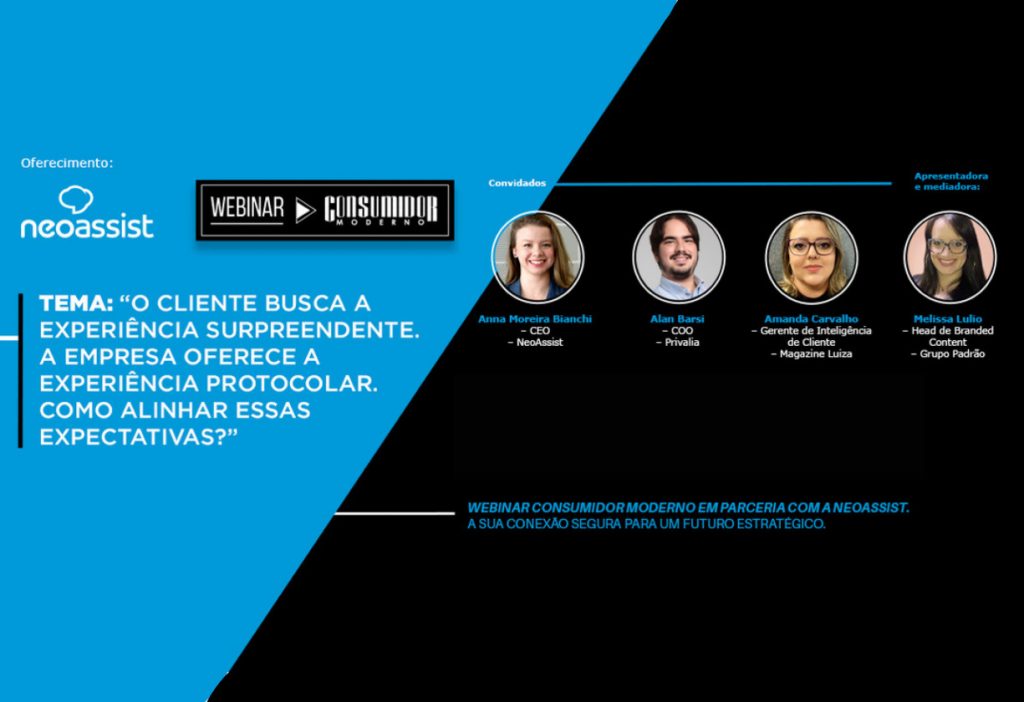 A questão foi o fio condutor do webinar “O cliente busca a experiência surpreendente. A empresa oferece a experiência protocolar. Como alinhar essas expectativas?”, da Consumidor Moderno, que ocorreu nesta quarta-feira (23). O evento contou com a presença de Anna Moreira Bianchi, CEO da NeoAssist; Alan Barsi, COO da Privalia e Amanda Carvalho, gerente de inteligência de cliente da Magazine Luiza, sob mediação de Melissa Lulio, Head de Branded Content do Grupo Padrão.