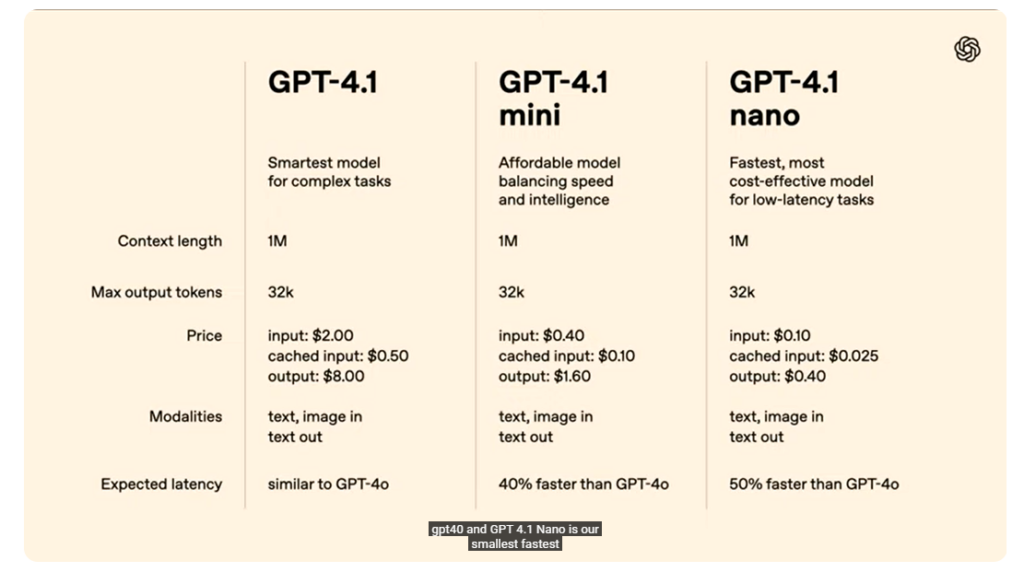 Enquanto o modelo GPT-4.1 se trata de uma evolução do modelo multimodal anterior da OpenAI, as versões avançadas do mini e nano, respectivamente, são aplicadas para uso eficiente em menor escala e operações em dispositivos locais com recursos limitados.