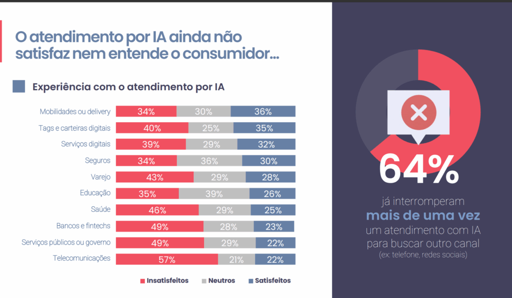 Ainda assim, a satisfação é baixa, mesmo nos setores que mais investem na tecnologia. “Temos uma curva de aprendizado grande. Os consumidores dizem: ‘sei que vou usar mais IA no futuro, estou aberto a isso, mas ainda estou insatisfeito’”, analisa Felipe.