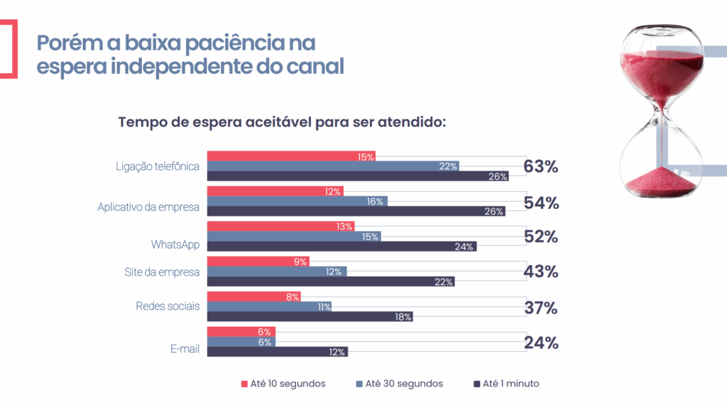 Antes de toda essa revolução tecnológica, os tempos eram outros. Se no passado, o brasileiro aceitava esperar por um vestido feito sob medida ou pelo próximo capítulo da radionovela, hoje a expectativa é outra. Com tantos canais de atendimento disponíveis, é preciso se atentar ao tempo de resposta de cada um deles. Isso porque o consumidor brasileiro anda muito impaciente. A pesquisa mostra que o tempo de resposta se tornou preciosa para a satisfação do cliente.