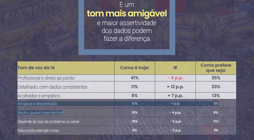 Outros dois perfis ganham protagonismo: o tom “detalhado, com dados consistentes”, sobe de 11% para 23%, um crescimento de 12 pontos percentuais, indicando que o consumidor quer mais profundidade e assertividade nas respostas. Já o tom “acolhedor e empático” sobe de 6% para 13%, reforçando o desejo por interações menos robóticas e mais humanas.
