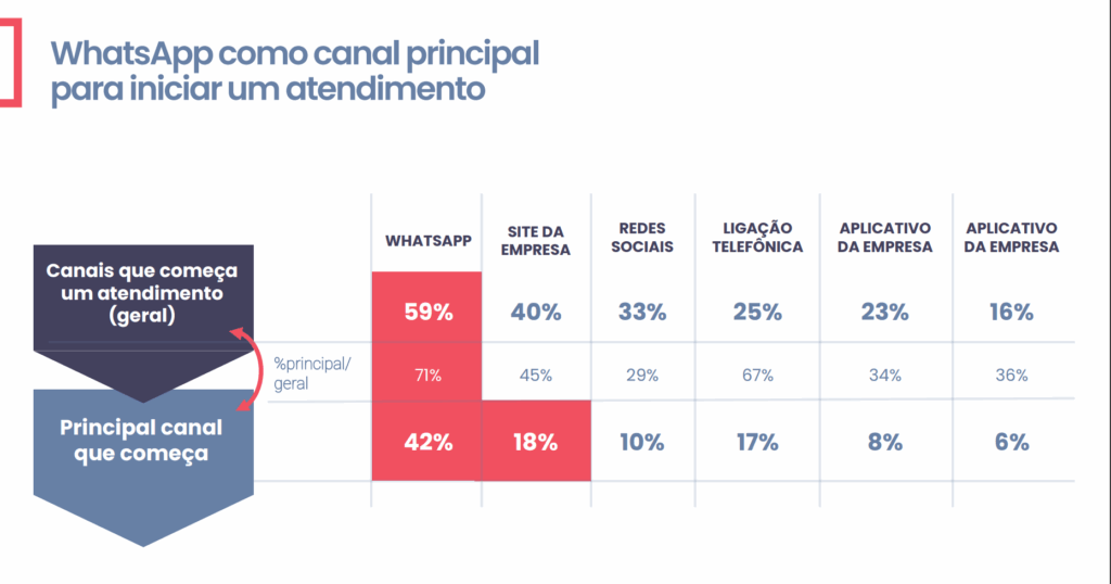 Antes de falarmos de IA, é preciso entender onde começa o relacionamento entre consumidor e empresa. O canal favorito disparado é o WhatsApp: seis em cada dez brasileiros iniciam o atendimento por lá. Em seguida vêm os sites corporativos (40%), redes sociais (33%) e o telefone (25%).