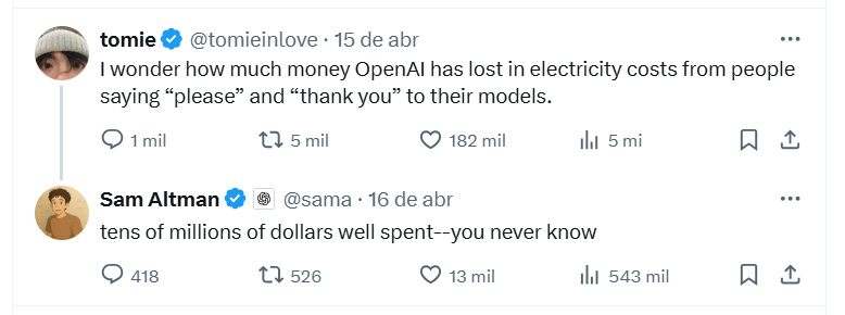 No dia seguinte, Altman respondeu: “Dezenas de milhões de dólares bem gastos – você nunca sabe”. A postagem, que rapidamente alcançou mais de meio milhão de visualizações e 13 mil curtidas, reacendeu uma conversa cada vez mais relevante: até onde vai o impacto humano na forma como interagimos com Inteligências Artificiais? E, por incrível que pareça, a ciência já tem respostas para essa questão.