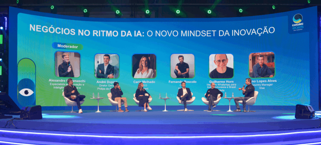 Durante o CONAREC 2025, o painel “Negócios no ritmo da IA: o novo mindset da inovação” reuniu executivos para debater os impactos da Inteligência Artificial (IA) nos negócios e na relação das marcas com os consumidores. O encontro contou com mediação de Alexandre Caramaschi, especialista em inovação e fundador da AI Brasil, e a participação de Carla Melhado, CEO da Mutant; André Duprat, diretor geral da Philips do Brasil; Fernando Boscolo, CEO da Privalia; Guilherme Horn, head do WhatsApp para Índia, Indonésia e Brasil na Meta; e Nuno Lopes Alves, country manager da Visa.