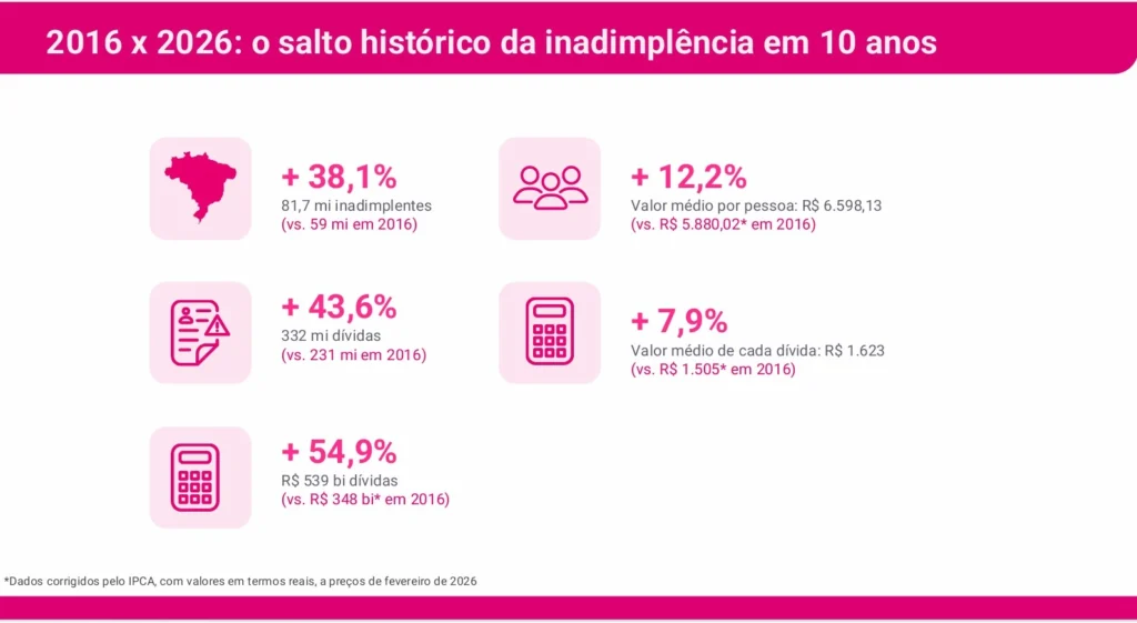 O Brasil atingiu um novo patamar de inadimplência. De acordo com o estudo Mapa da Inadimplência – 10 anos, da Serasa, o País chegou a 81,7 milhões de inadimplentes em 2026, um salto de 38,1% em relação a 2016.