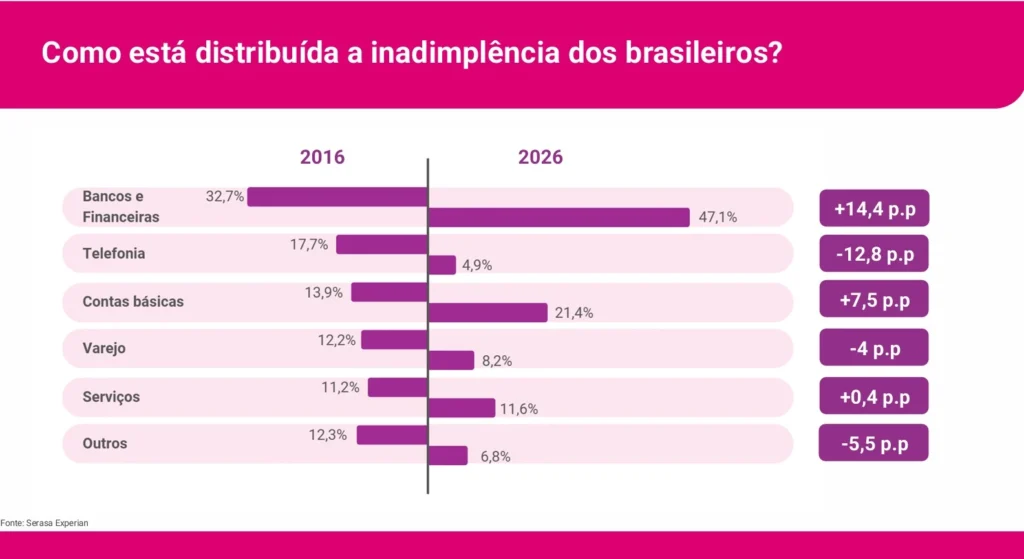 Outro dado relevante está na origem das dívidas. A participação do setor financeiro cresceu e hoje representa cerca de 45% da inadimplência, acima do período pré-pandemia.