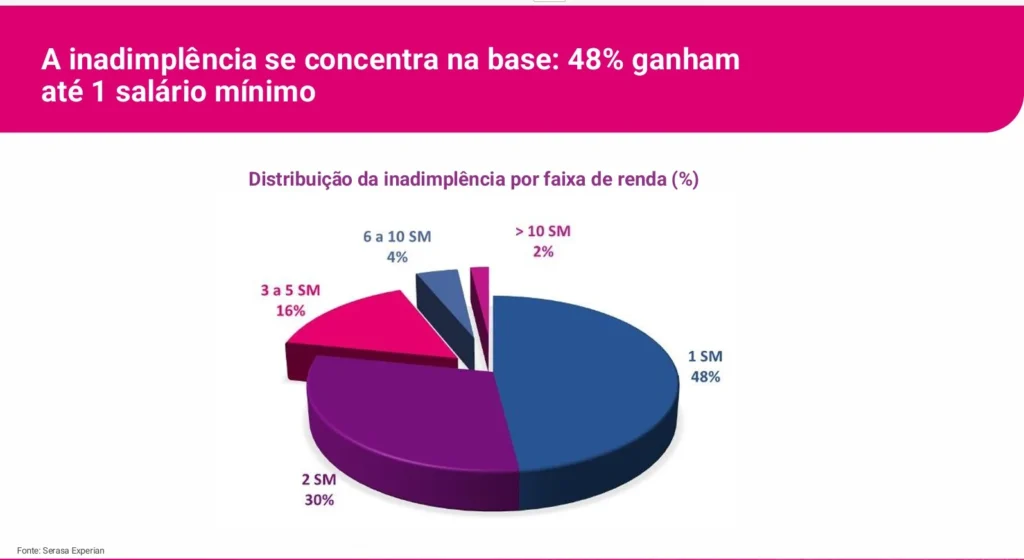 Outro dado crítico está na renda: 48% dos inadimplentes ganham até um salário mínimo. Ou seja, a inadimplência se concentra justamente onde há menor capacidade de reação financeira.