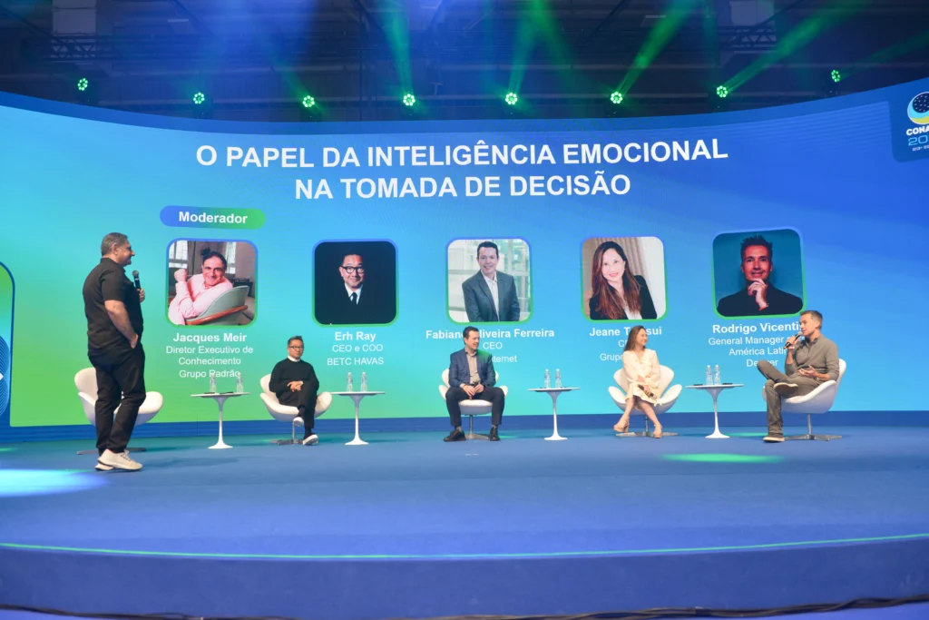 Não por acaso, tive a oportunidade de conduzir um painel sobre Inteligência Emocional e tomada de decisão. Na conversa com os CEOs, foi nítido perceber que dados sem sensibilidade não sustentam decisões. Rodrigo Vicentini, da Deezer, lembrou que há momentos em que o dado não mostra o que está errado e é a intuição que guia. Jeane Tsutsui, do Grupo Fleury, reforçou a importância de montar times colaborativos e emocionalmente inteligentes para que a tecnologia seja realmente útil. Fabiano Oliveira, da Vero Internet, dedicou-se à escuta ativa para integrar culturas e ouvir clientes, enquanto Erh Ray alertou que lideranças brilhantes sem “corações inteligentes” não prosperam.