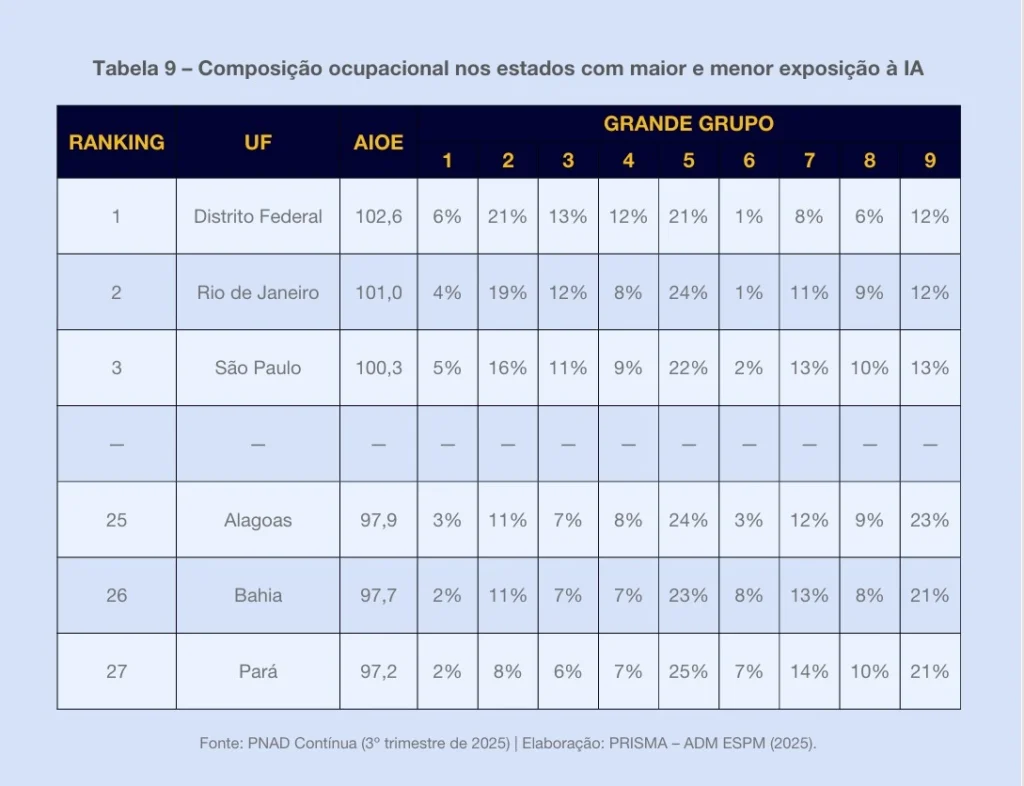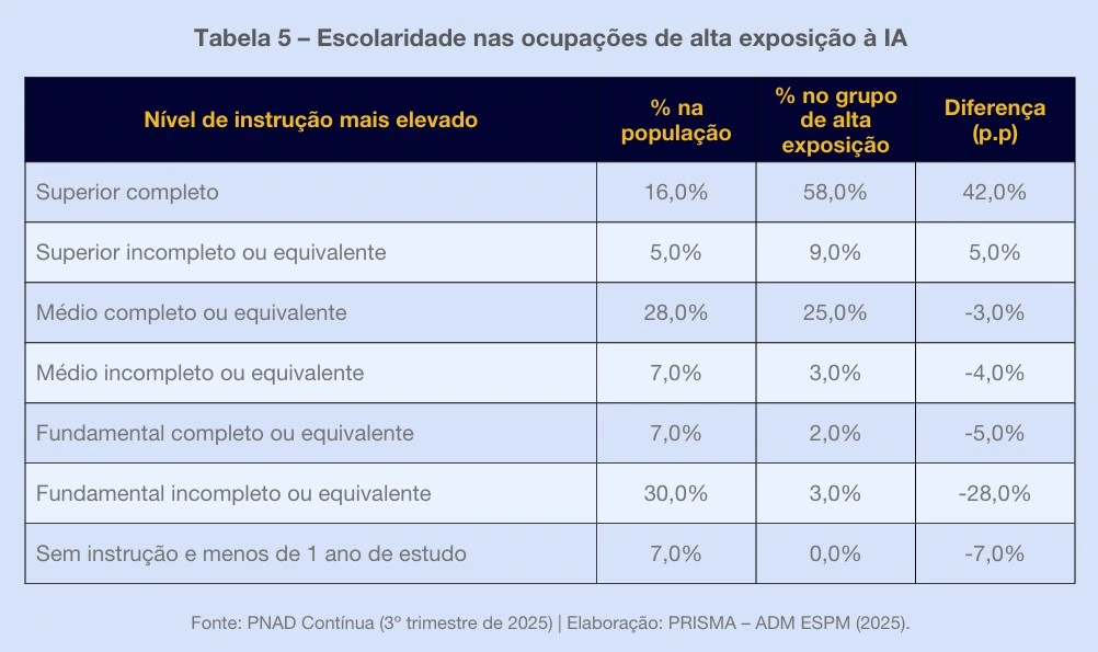 Outro dado expressivo está na escolaridade. Embora apenas 16% da população ocupada tenha ensino superior completo, esse grupo representa 58% nas ocupações de alta exposição à IA.