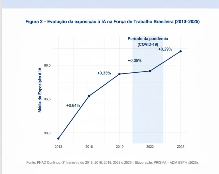 O estudo acompanha a evolução desde 2013. A exposição média da força de trabalho brasileira à IA aumentou continuamente ao longo dos anos, estabilizou durante a pandemia e voltou a crescer após 2022.