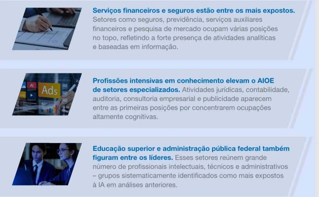 Setores como serviços financeiros, consultoria, jurídico, marketing, educação superior e tecnologia aparecem entre os mais expostos. Empresas que atuam nessas áreas precisarão investir em: