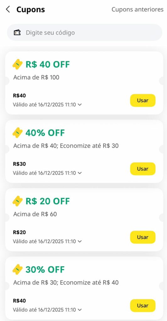 Baixar o app e criar o cadastro é rápido e soa familiar: nome, telefone, e-mail, senha e endereço. Uma jornada parecida com a dos concorrentes. Mas um detalhe já chama atenção: a agressividade dos cupons.
