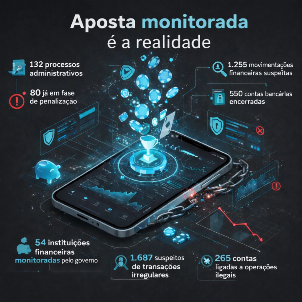 A fiscalização também avançou sobre o caminho das fraudes e das perdas financeiras. Até o fim de 2025, 54 instituições financeiras e de pagamento comunicaram à SPA mais de 1.255 movimentações suspeitas, relacionadas a 1.687 pessoas com indícios de transferências para bets não autorizadas.