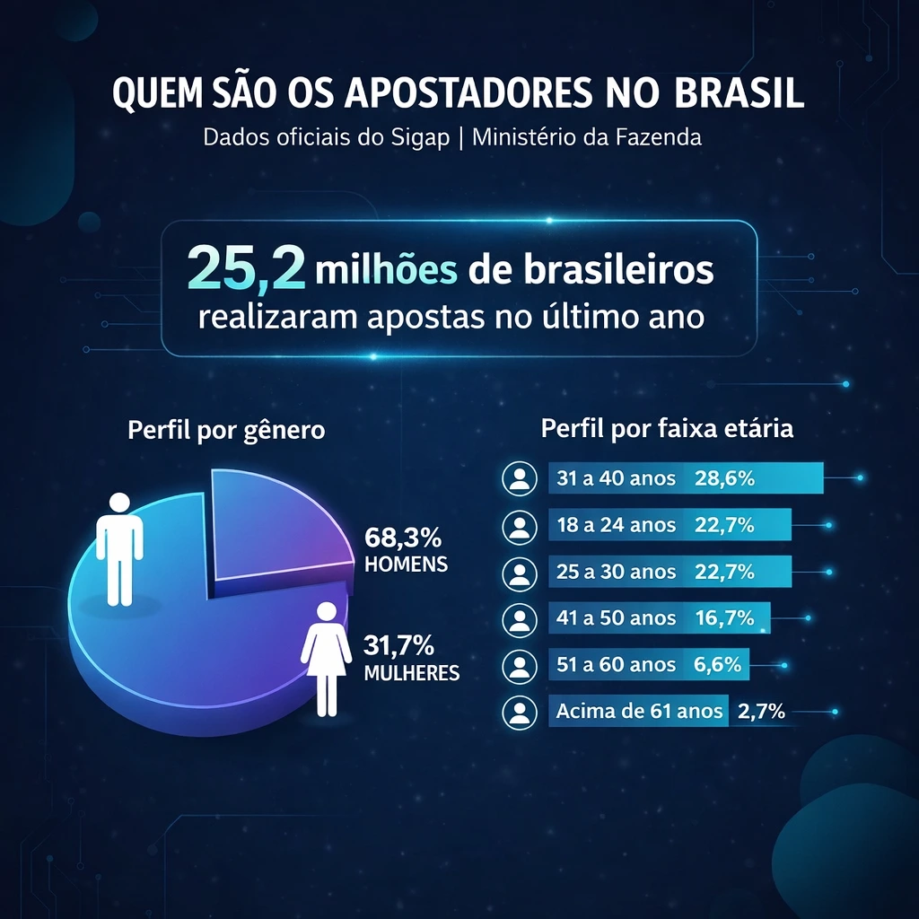 Dos 25,2 milhões de brasileiros que realizaram apostas nas 79 plataformas que agem de acordo com a regulamentação no ano passado, 68,3% são homens e 31,7%, mulheres. As informações constam do relatório acumulado do Sigap do Ministério da Fazenda, que recebe, diariamente, dados de todas as apostas realizadas pelas 79 empresas autorizadas a explorar apostas de quota fixa.