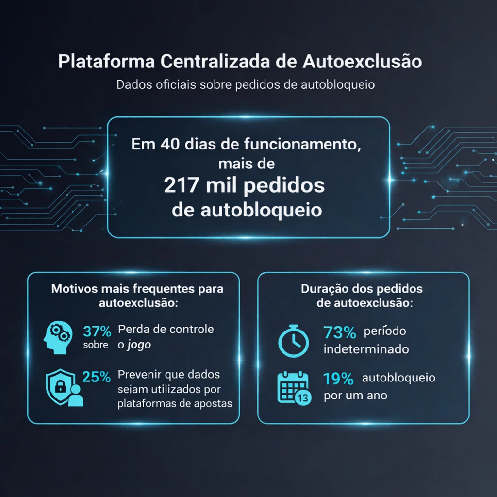 Em primeiro lugar, o motivo mais frequente (37%) foi “Perda de controle sobre o jogo – saúde mental”. Em segundo lugar, “Prevenir que meus dados sejam utilizados por plataformas de apostas” (25%). A maioria das autoexclusões (73%) é de período indeterminado, e 19% são pedidos de autobloqueio por um ano.