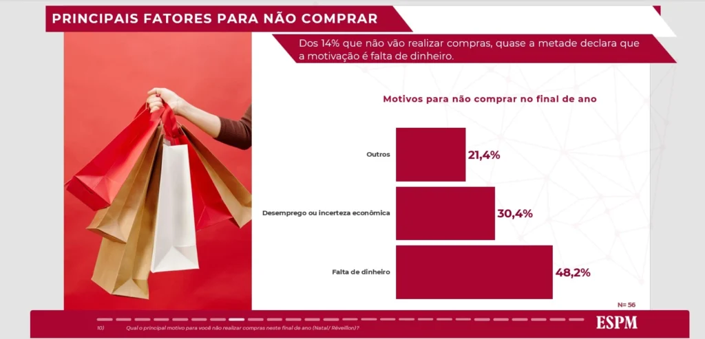 Entre os 14% dos consumidores que afirmam que não vão realizar compras neste final de ano, o dado mais expressivo é também o mais revelador: 48,2% apontam falta de dinheiro como principal motivo. O número evidencia como a restrição financeira permanece como o maior limitador da participação plena do consumidor no ciclo de consumo natalino – ainda que a maioria da população mantenha o hábito de comprar, mesmo reorganizando prioridades.