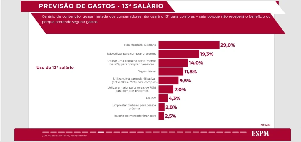 Sobre o 13º salário, o slide abaixo revela um cenário de forte contenção. Quase metade dos consumidores não usará o 13º salário para compras, seja porque não receberá o benefício (29%) ou porque pretende segurar gastos (19,3%). Entre os que usarão, a maioria destinará apenas uma pequena parte para presentes, enquanto 11,8% priorizarão o pagamento de dívidas – evidenciando a pressão financeira que convive com a intenção de consumo para o fim do ano.
