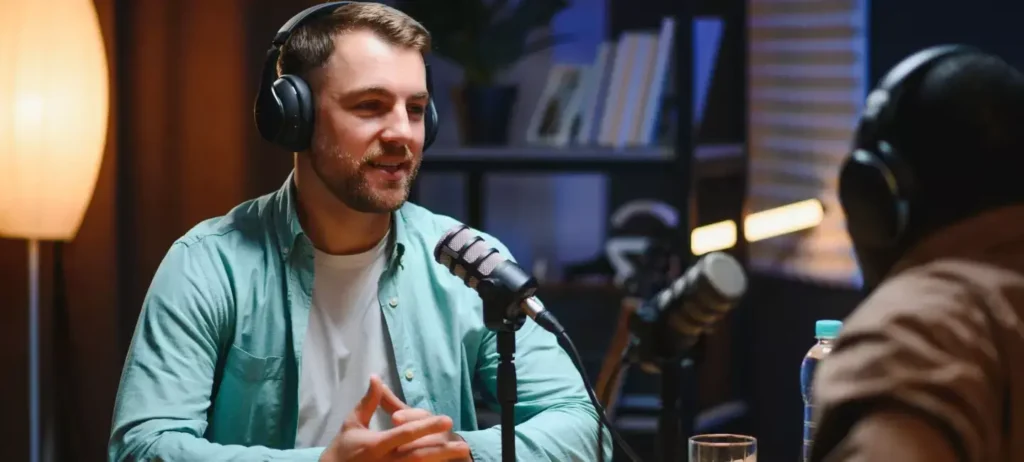 Mas gente, podcast é um bate-papo. O formato da mesa e o microfone grandes são legais, mas você pode quebrar um pouco isso, criando cenários diferentes, como em um talk show, por exemplo, com sofás e boas lapelas. As pessoas gostam do diálogo, da identidade!