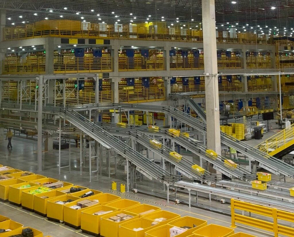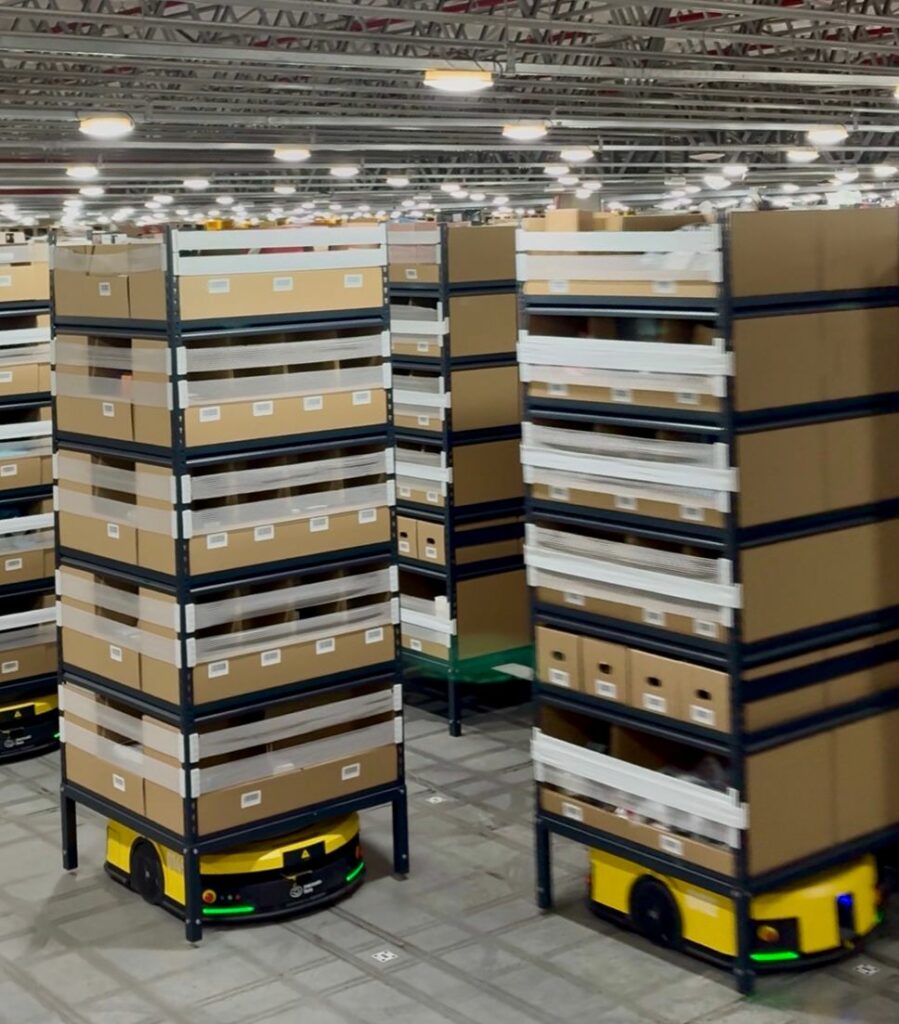 Os mais de 300 robôs autônomos movem-se em sincronia, guiados por códigos no piso. Eles aceleram, freiam, desviam e ajustam rotas sem colisões, entregando estantes inteiras diretamente às estações de separação. Ali, cada item é depositado nos tradicionais totens amarelos, que seguem por esteiras e softwares de triagem capazes de direcionar pacotes para dezenas de destinos diferentes.