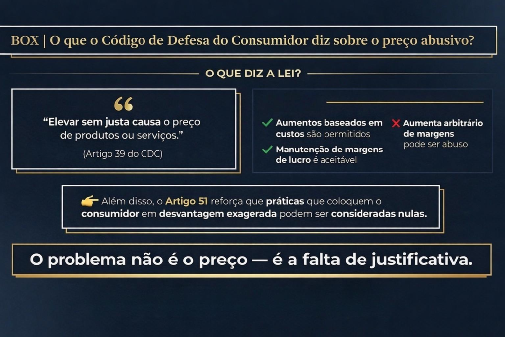 Além disso, o artigo 51 reforça que práticas que coloquem o consumidor em desvantagem excessiva podem ser consideradas nulas. Ou seja: o problema não é o preço – é a ausência de justificativa.