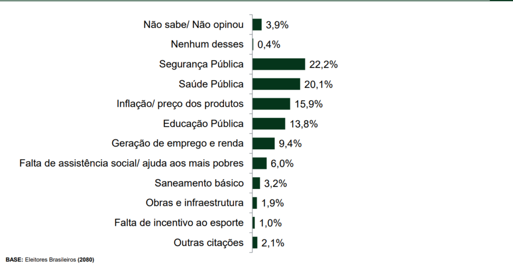A percepção varia conforme a região do País. No Sudeste, a segurança pública lidera com 23,7% das menções, assim como no Nordeste, onde o tema foi citado por 22,7% dos entrevistados.
