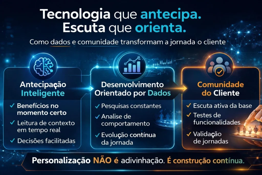 A escuta ativa, por meio de pesquisas e testes de jornada, complementa os dados. Esse conjunto orienta ajustes contínuos para garantir uma experiência cada vez mais simples e integrada.