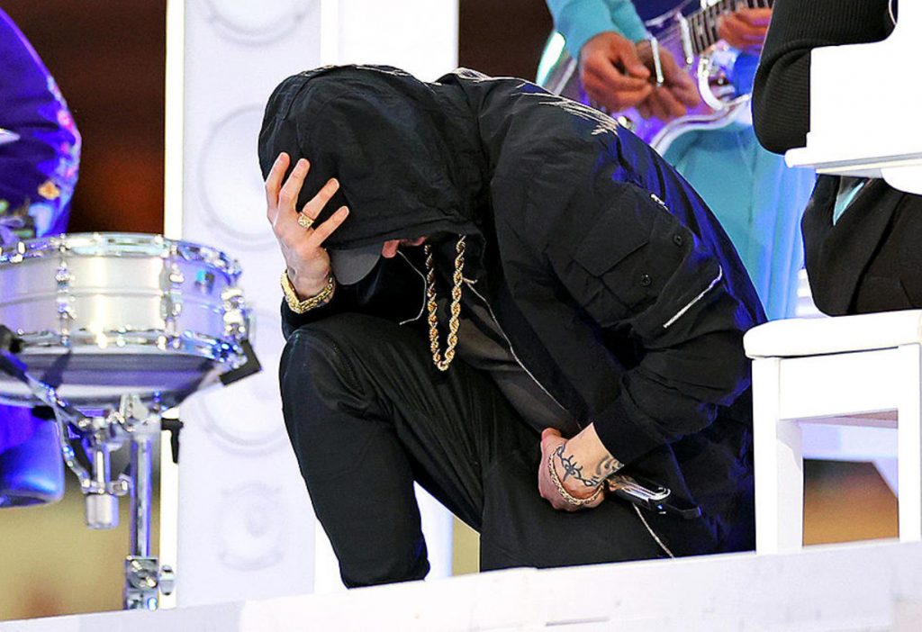 Além dos shows, jogo e festividades, houve um gesto do Super Bowl 2022 que chamou a atenção de parte dos espectadores do evento. A ação foi do rapper Eminem: ao final de sua apresentação, o cantor se ajoelhou em silêncio, mesmo após chefões da liga terem recusado o posicionamento. O gesto, carregado de simbologia, vem em referência ao quarterback Colin Kaepernick, que, em 2016, passou a se ajoelhar ao longo do hino nacional dos Estados Unidos como forma de protesto contra a violência racial do país.