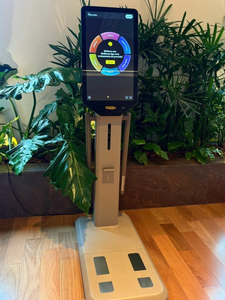 Outro diferencial está na avaliação física feita por uma máquina que reúne as maiores tecnologias da bioimpedância. A análise pode durar até uma hora e verifica não apenas a composição corporal, mas também força, mobilidade, equilíbrio, mente e sistema cardiovascular, tudo isso integrado com os demais aparelhos.