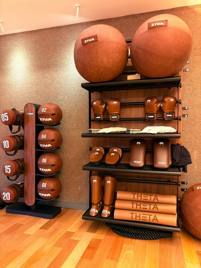 Os equipamentos, exclusivos da unidade, também fogem do padrão tradicional das academias. Eles nem de longe lembram aqueles escuros e agressivos de outros players do mercado. São claros, em tons terrosos, quase como peças de design integradas ao ambiente.